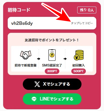 するとマイページに移動後、下にスクロールをすると、あなたの招待コードが表示されているので「タップしてコピー」を押して使用をします。